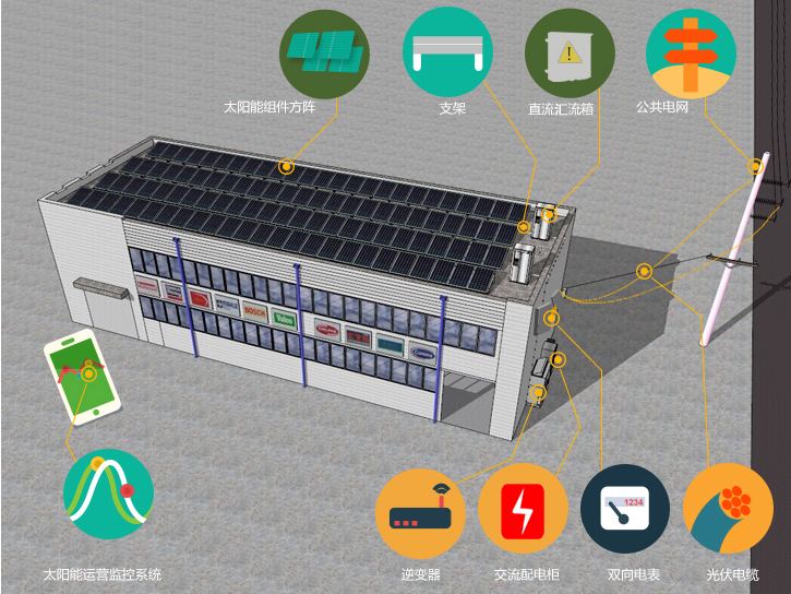 工商用分布式光伏系統(tǒng)主要由光伏組件、匯流箱、支架、逆變器及監(jiān)控系統(tǒng)組成,安裝在廠(chǎng)房、車(chē)棚屋頂,發(fā)電量自發(fā)自用、余電上網(wǎng)。